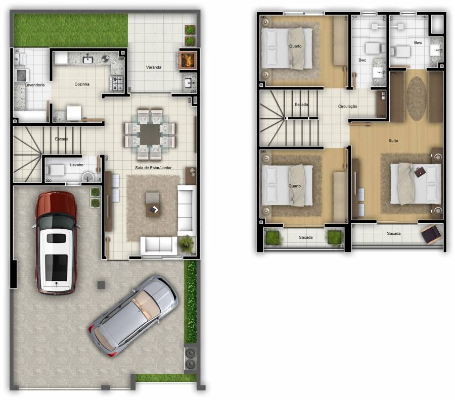 Sala de estar/jantar, cozinha e lavanderia separadas, lavabo, dois quartos, suíte, sacada nos quartos, varanda com churrasqueira e pia, espaço para três carros.